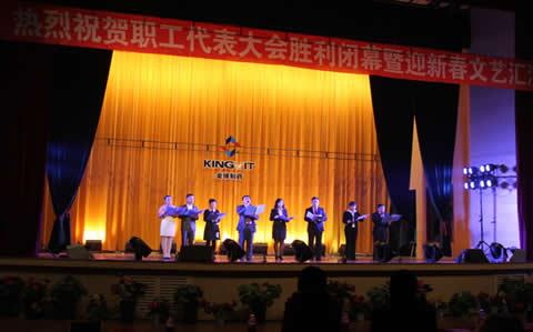 為了慶祝公司第一屆一次職工代表大會順利閉幕,活躍公司廣大職工的文化生活,讓員工提前度過一個歡樂、祥和的春節(jié),在公司黨支部和工會委員會的精心策劃下,在基層分會全體員工的的共同努力下,加班加點排練節(jié)目,為了使每個動作表演到位有效果,演出精彩上檔次,職工對節(jié)目一遍又一邊遍的進行排練、修正,并籌集了演出的服裝、道具,以最高的表演水平充分展示金維公司員工的良好精神面貌。2013年1月19日下午16時,由公司黨支部和工會委員會聯(lián)合舉辦的慶祝公司第一屆一次職工代表大會順利閉幕暨“迎新春”文藝節(jié)目匯演大型晚會,在一片歡慶祥和的新春祝語聲中拉開了帷幕,公司總經(jīng)理陳德剛、副總理高勇、副總經(jīng)理魏偉、財務總監(jiān)高廣禮、生產(chǎn)總監(jiān)王智和公司工會主席劉海玉等領導和公司全體員工觀看了文藝節(jié)目演出活動。